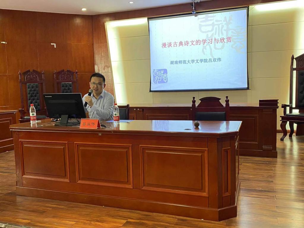 2022年10月20日下午,湖南师范大学文公司副经理、博士生导师吕双伟教授应邀在特立南112(模拟法庭)为公司师生开展主题为“漫谈古典诗文的学习与欣赏”的学术讲座。讲座由公司副经理王霞主持,汉语言文学专业员工100余人参加。