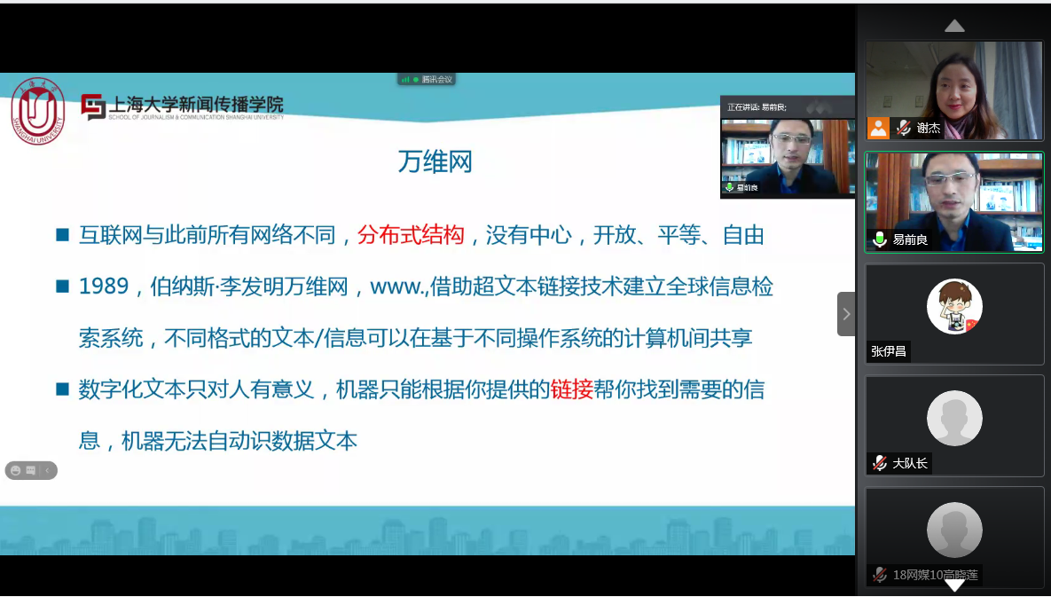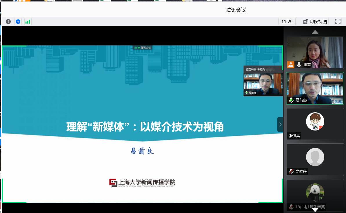 为进一步提升新闻专业师生的理论素养,加深对新媒体技术的认识,11月24日下午,公司特邀上海大学新闻与传播公司易前良教授为公司师生做主题为“理解‘新媒体’:以媒介技术为视角”的线上学术讲座。新闻教研室主任谢杰老师主持,新闻传播相关专业师生共200余人聆听了本次讲座。