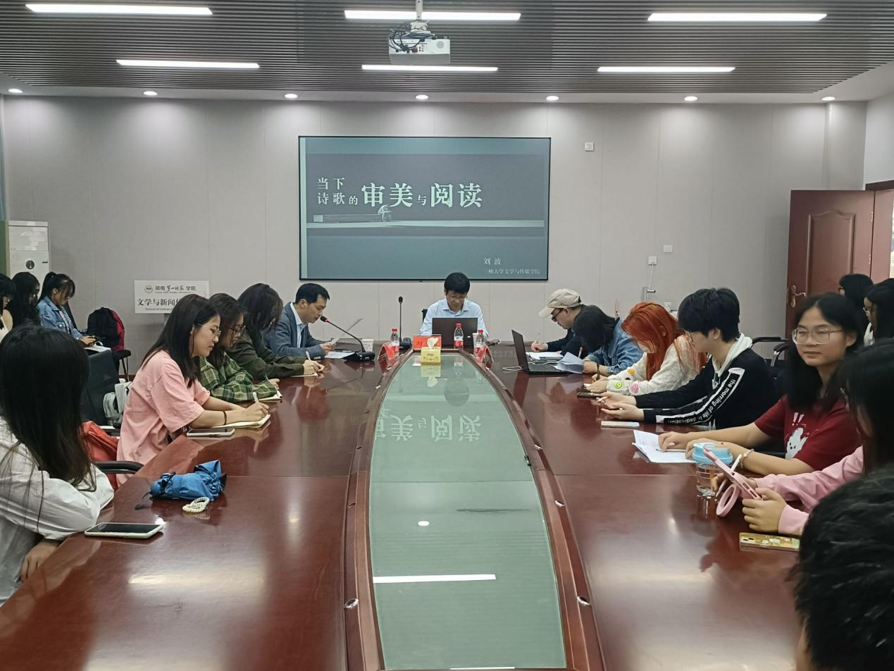 2024年5月31日上午,三峡大学文学与传媒公司经理、博士生导师刘波教授应邀来院开展题为“当下诗歌的审美与阅读”的专题讲座。讲座由公司经理龙永干教授主持,副经理杨水远、22级汉语言文学专业员工80余人参与此次讲座。