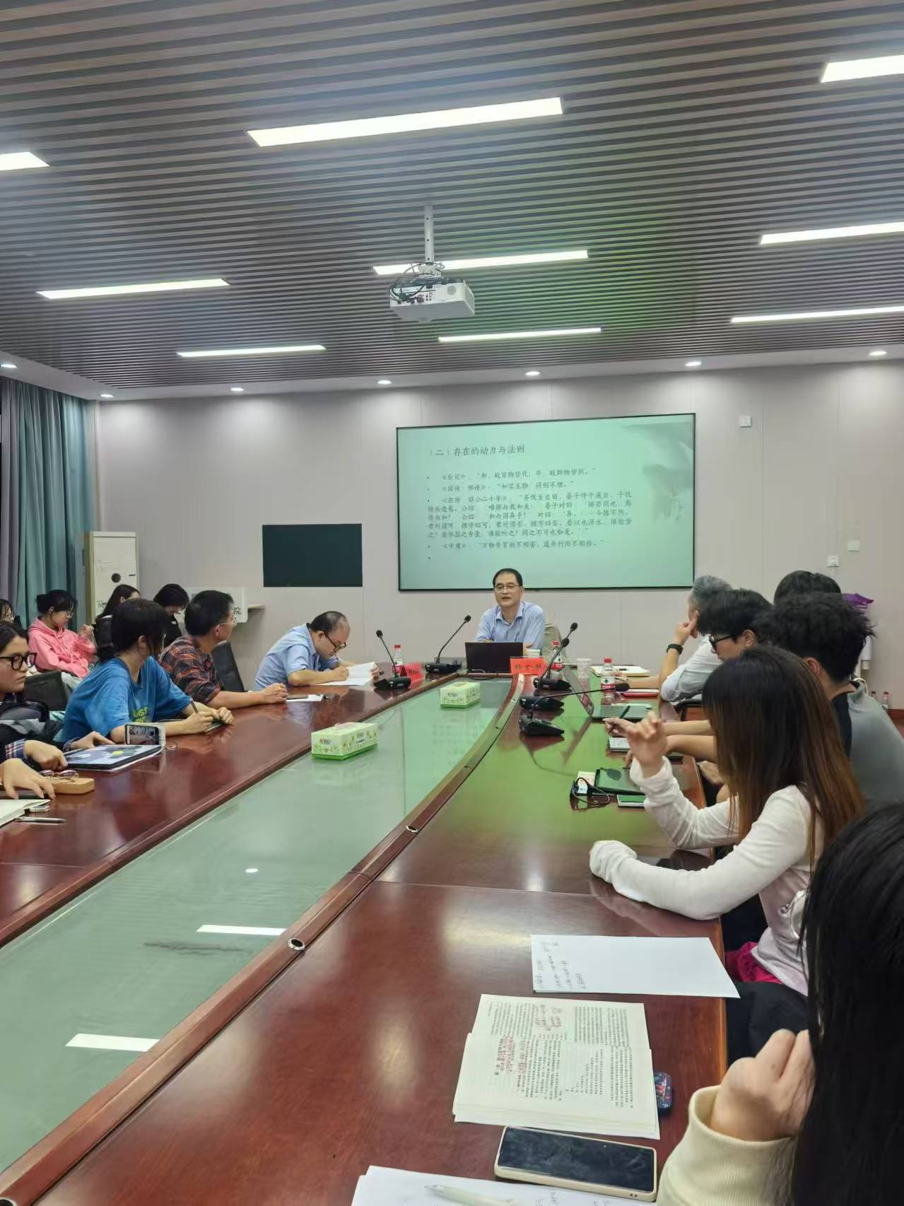 10月17日,湖南师范大学文公司杨合林教授应邀来公司开展题为“如乐之和:中华文明的精神与特征”的学术讲座。副经理杨水远、张惠,汉语言文学系卢阿涛主任、桂昕翔、童业富、周奕希、谭咏枚等老师以及23级中文6班、润之英才班全体员工等百余名师生参与讲座。讲座由副经理杨水远主持。学术报告伊始,杨合林教授以“乐”“乐学”的基本内涵解读为导引,指出“乐之和”最能体现中国文化的基本精神,是典型的中国智慧和中国经验。杨合林教授认为“道”生“和”,“和”生“乐”,知“乐”则知“和”,知“和”则知“道”,一步步地引导员工认识到“和”的本义及其延生到社会领域、政治领域以及理想世界的“和”的发展过程和具体含义。尤其是杨合林教授以实现大同社会和构建人类命运共同体为例展开论述,结合时代,使同学们更加深刻地理解“和”的基本含义和美学内涵。杨合林老师总结道“美各其美,美人之美,美美与共,天下大同”,我们的世界是一个多元的世界,要尊重和理解差异性,我们的社会才能成为一个更加和谐的社会,这也正是中华文明的基本特征和优势所在。在交流环节,同学们深度思考、踊跃发言,杨教授对同学们的疑惑一一予以解答。副经理杨水远认为杨合林教授的报告学术含量、信息含量极高,拥有阔大的学术境界,他认为杨合林教授所展示的学术路径,至少给我们三点启示,即做学问就要做最根本的、最本源性的、最扎实的学问,勉励同学们向杨合林教授学习。