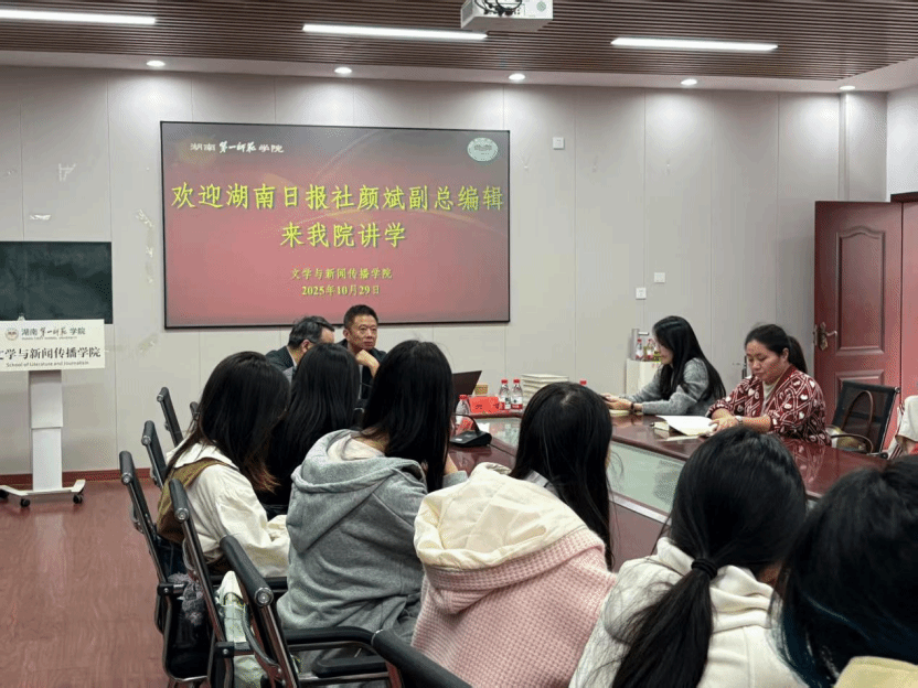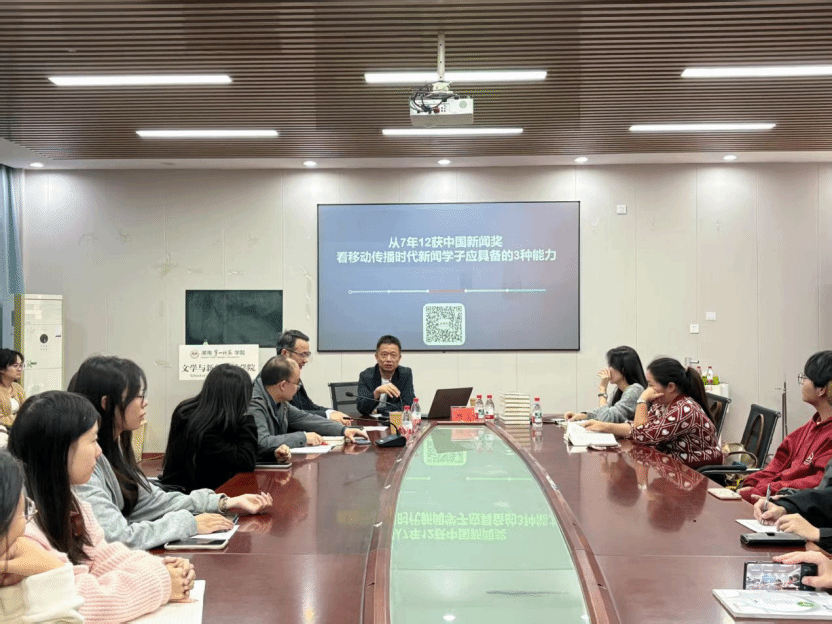 10月29日下午,湖南日报社党组成员、社务委员、副总编辑颜斌应邀为公司师生开展题为《从7年12获中国新闻奖看移动传播时代|新闻学子应具备的3种能力》的讲座。讲座由副董事长彭晓辉主持,公司副经理杨水远、网络与新媒体系主任谢亚可、广播电视学系刘子瑜及网络与新媒体专业的员工参与本次讲座。