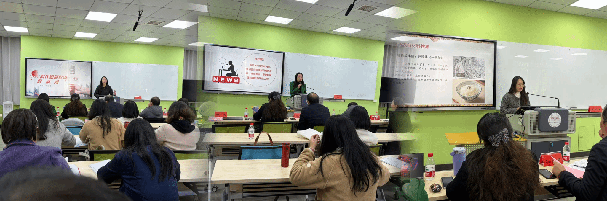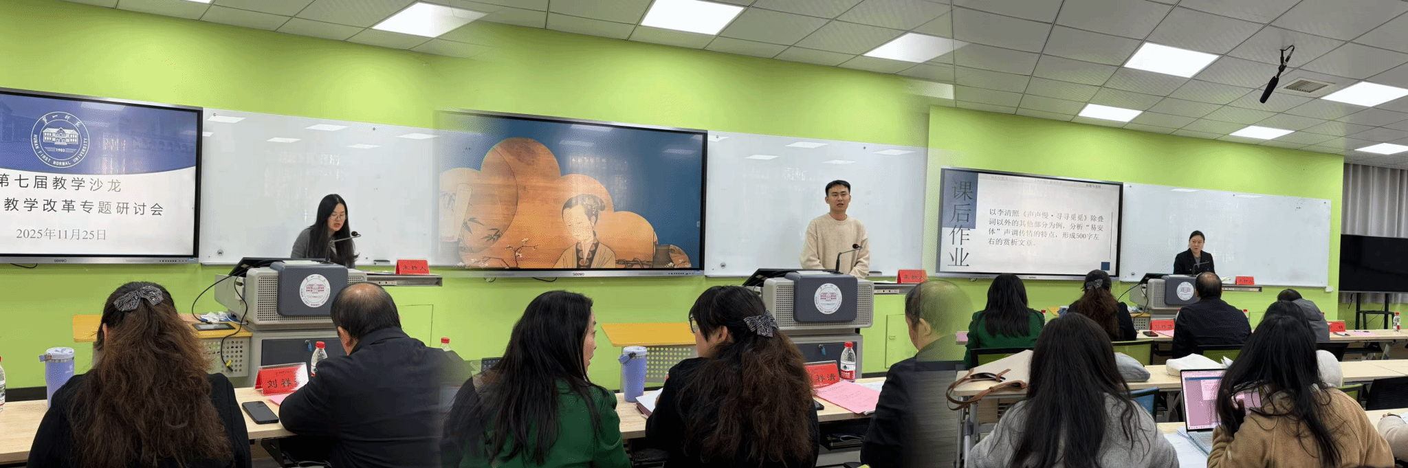 本次教学沙龙以“字韵·字辨·字鉴”为核心主题,紧扣AIGC时代教育数字化转型趋势,深入探讨信息技术与文学、新闻传播学课程深度融合的路径与可能性。会上,张雨顺、屈玉辉、刘子瑜三位教师分别以新进教师汇报课、青年教师教研课、优秀教师示范课为载体,分享金课建设与课程改革的实践探索,呈现了分层递进、各有侧重的教学示范。其中,张雨顺以“李清照《声声慢》的叠词艺术”为题,从情感表达、节奏变化、声调选择三个维度展开深度解析,引导员工沉浸式体悟“易安体”韵律和谐、声调传情的艺术特质;教学中创新运用“雨课堂”平台实时呈现员工讨论成果,并通过AI大数据分析高频词汇,精准检验教学目标达成度,实现了传统文学课程与现代技术的有机结合。屈玉辉的教研课聚焦异体字这一特殊语言现象,以古代典籍中“碗”的字形演变为例,系统剖析异体字的产生根源与文化内涵;课堂深度融入AIGC技术,通过AI模拟历史人物参与讲解、超星教学平台精准分析员工答题数据等创新形式,为AI赋能传统语言类课程提供了可复制、可推广的实践案例。刘子瑜的示范课以“AIGC时代真假新闻鉴别”为核心,精选时效性强、典型性突出的新闻案例,系统提炼AI假新闻的多维特征,引导员工主动探索辨别方法与实践路径,充分彰显了新闻传播学课程“理论联系实际”的学科特色。