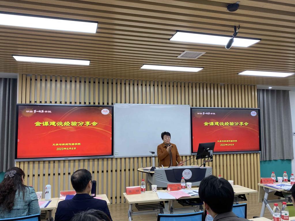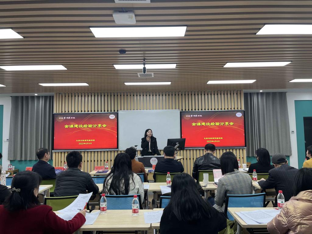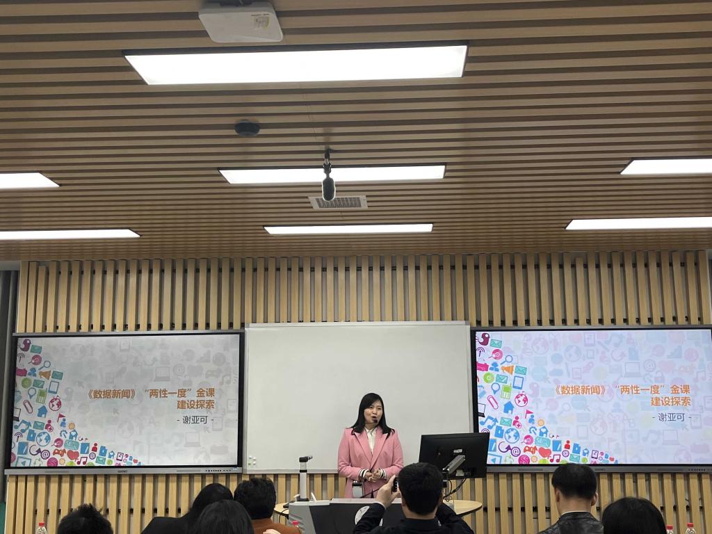 在金课建设分享会中,2022年“湖南省普通高校课堂教学竞赛二等奖”获奖教师谢亚可和“湖南省普通高校课程思政教学竞赛二等奖”获奖教师赵姣分别从不同角度分享了金课建设经验。谢亚可老师以“数据新闻”课程为例,结合新文科建设的需求,分享了如何在课程中展开线上线下混合式教学的经验。赵姣老师为大家分享了“现代汉语”课程思政建设的成效。她认为,现代汉语是一门贴近生活的基础课程,应当做到立足于国家语言政策和我们的语言生活,明确教学目标和育人需求,充分挖掘思政元素,积极探寻课程思政案例,善于利用多种教学方法将课程思政与课程内容有机结合,全面打造“行走的课程思政”,真正提升课程思政建设水平。