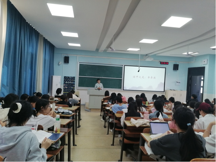 此次活动分为两个流程。第一个流程由刘汾老师在怀中南205教室为大家呈现一节“中国古代文学”的示范课。刘汾老师引导大家理解辛弃疾作为“不得志的英雄”的人格与情感,并从避祸、应时、尊体三个层面分析他“有意作词”的原因,进而理解辛弃疾词作中所表现的整体人格,深入感知辛词如何于豪壮之中内蕴要渺,如何呈现“肝肠似火,色貌如花”的双重意味,以及“摧刚为柔”“潜气内转”的艺术范式。