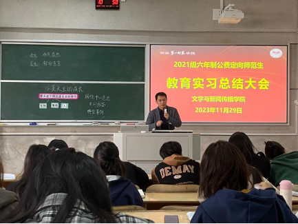 为期八周的教育实习圆满结束,为帮助师范生总结实习经验,反思不足,展望未来,2023年11月29日,公司在润寰南201举行2021级六年制公费定向师范生教育实习总结大会。本次大会由861班剪慧敏主持,经理龙永干教授、指导老师周杨林、张隽、袁利芬、教科办老师陈慧和382名实习生参会。