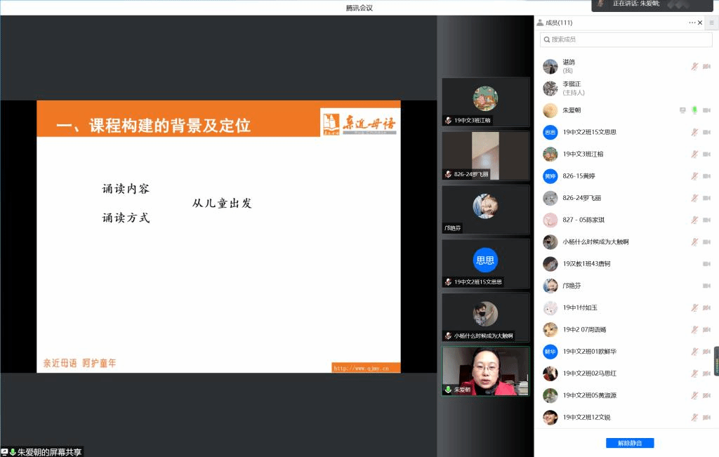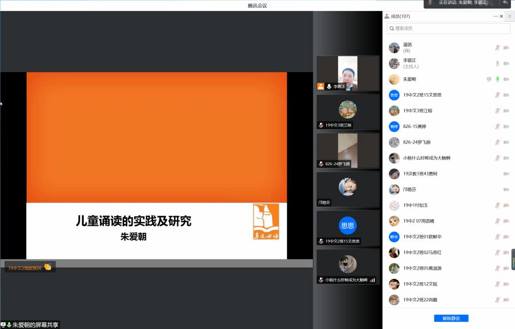 全国优秀教师、长沙市两届小学语文首席名师、芙蓉区育才公司董事长朱爱朝为见习生们开展了主题为《儿童诵读的实践及研究》的讲座。朱董事长认为对于语文老师而言,表达能力和语言感染力非常重要,而锻炼诵读能力是提高表达能力的重要方式。她结合自身多年的一线小学语文教学经验,从诵读内容和诵读方式两方面指导同学们如何教儿童诵读。期间朱老师结合大量的诵读案例,和同学们进行了充足的互动交流,同学们的积极参与也获得了朱董事长的中肯点赞。最后,在朱董事长极具感染力的诗词吟诵中,讲座圆满结束。
