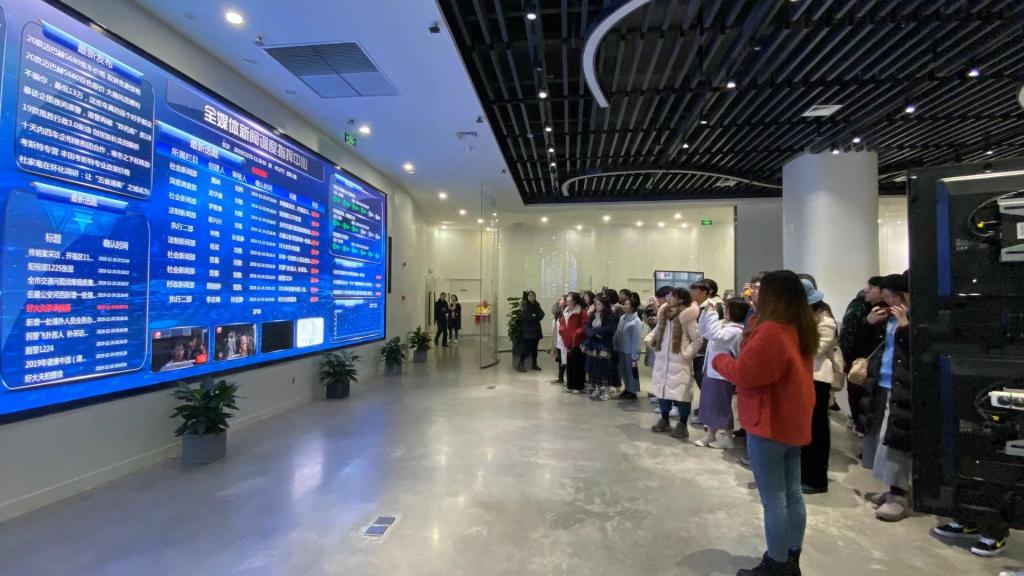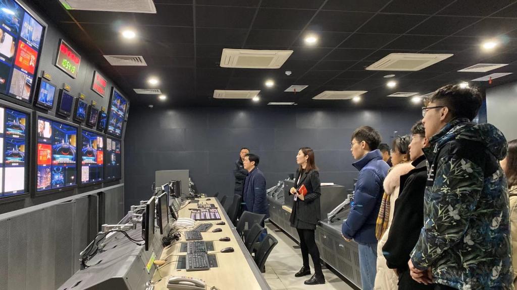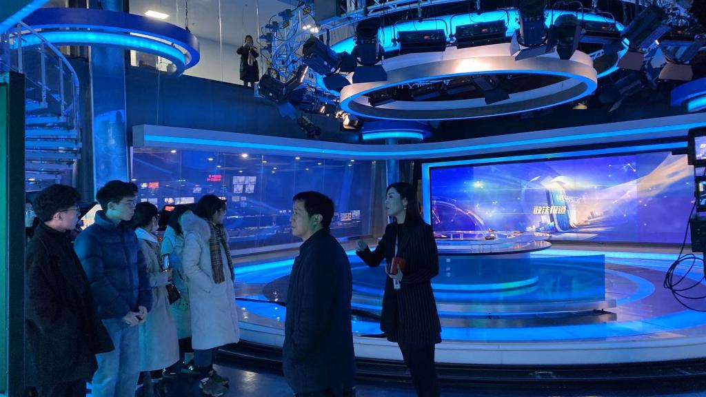 会后,师生们参观了长沙广电的700米演播厅以及全媒体新闻调度指挥中心。在演播厅,曾郁静女士向大家介绍了电视节目录制中的现场调度。在全媒体中心,王璇女士带领同学们深入了解融媒体时代新闻采写制作的整体流程。参观结束后,针对同学们提出的问题,工作人员也进行了详细的解答。