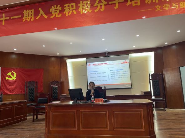 来自21级中文2班的张佳雯同学代表全体学员发言,坚定表明了自己的入党决心,且呼吁同学们要提高思想政治素养,严于律己,树立服务党和人民的意识,进而在实践中考验自我、磨砺自我,早日书写属于一名合格党员的新篇章!