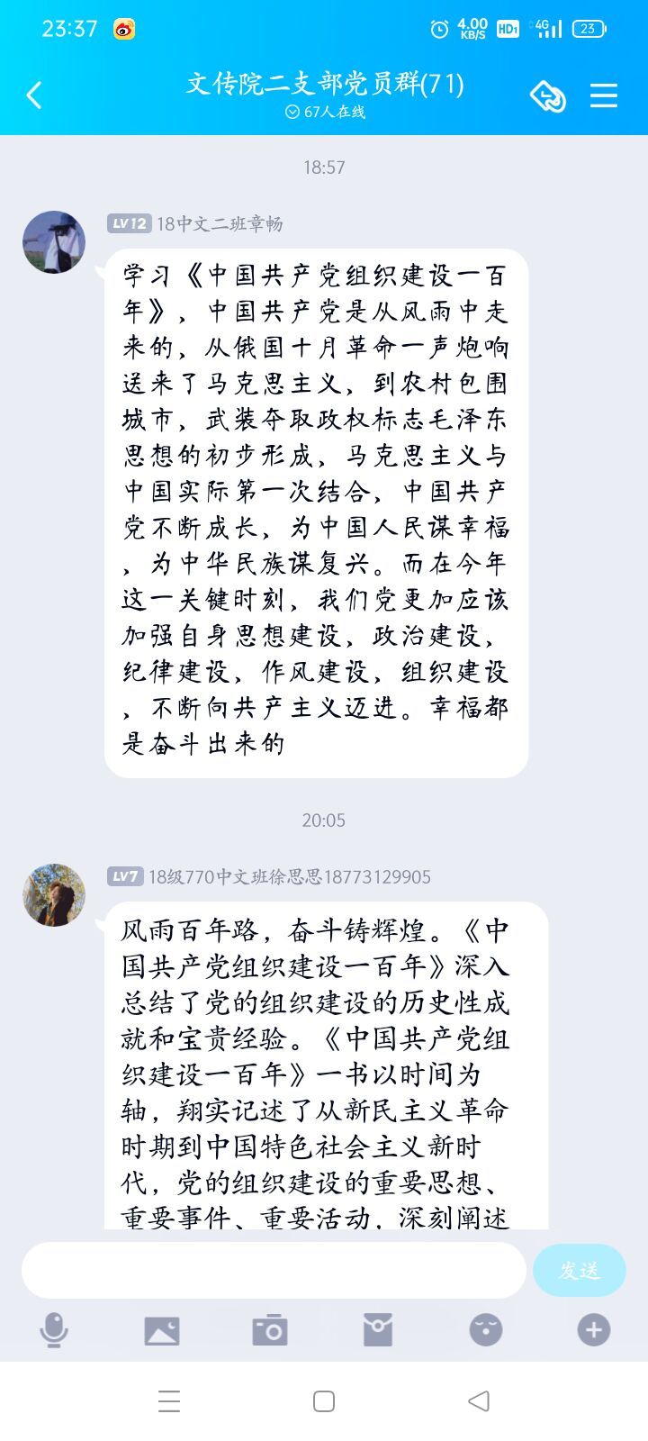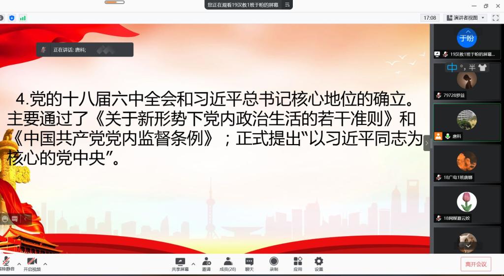 会议以学习《中国共产党组织建设一百年》为主要内容。该书详细地讲述了党组织建设的重要思想、事件与活动,记录了各个时期的中国共产党人为党和人民不断奋斗的高尚情怀和勇于斗争的精神风貌,为每一位党员研究党史提供了丰富的材料。接着,老师分别从书的框架、核心内容、对青年党员的建树性意义等向党员们进行系统介绍。党员们时而标注重点,时而简写批注,并及时在群里积极讨论表达自己的看法、分享自己的心得,形成了一阵优良的学风。最后,大会在老师对各位党员的期盼与要求中落下帷幕。