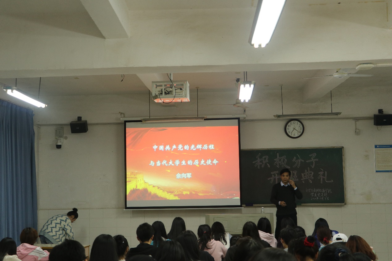 为加强党的组织建设,切实做好入党积极分子的培养、教育工作,把好党员“入口关”,11月9日晚七点整,公司第六期入党积极分子培训开班典礼在玉衡北210教室举行。公司分党校董事长佘向军同志、副董事长欧阳范剑同志、员工第一党支部书记唐科同志、副书记陈滢琪同志、员工第二党支部书记安炜成同志、副书记赵雅兰同志、院团总支书记张忺寒同志、刘晨晨同志出席了开班典礼,66名入党积极分子参加了此次典礼及培训。