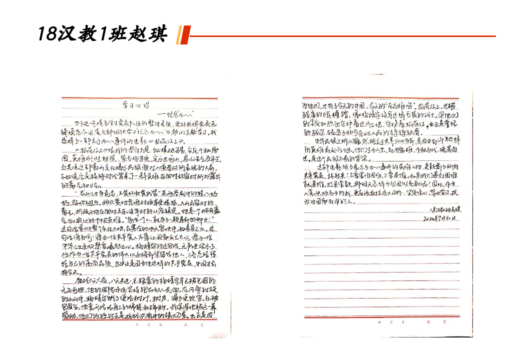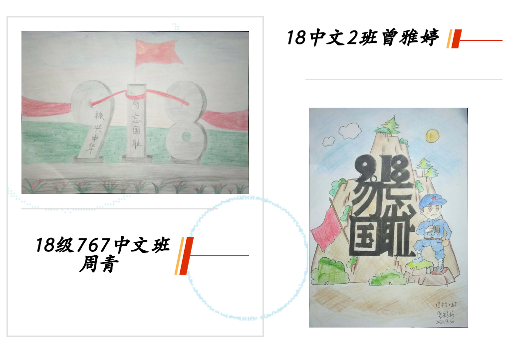 本次党日活动,围绕主题上交了众多优秀作品。其中有:18汉教1班赵祺上交的关于九一八事件的电影《松花江上》的观影心得;18中文2班曾雅婷精心设计的主题手抄报;18级766中文班王妙琪用古筝弹奏《我和我的祖国》的视频,以及众多同志书写爱国警句的书法作品、海报制作图。这些形式丰富的学习展示材料,都充分体现了活动精神的贯彻,呈现了全体党员和入党积极分子爱国积极的精神面貌。