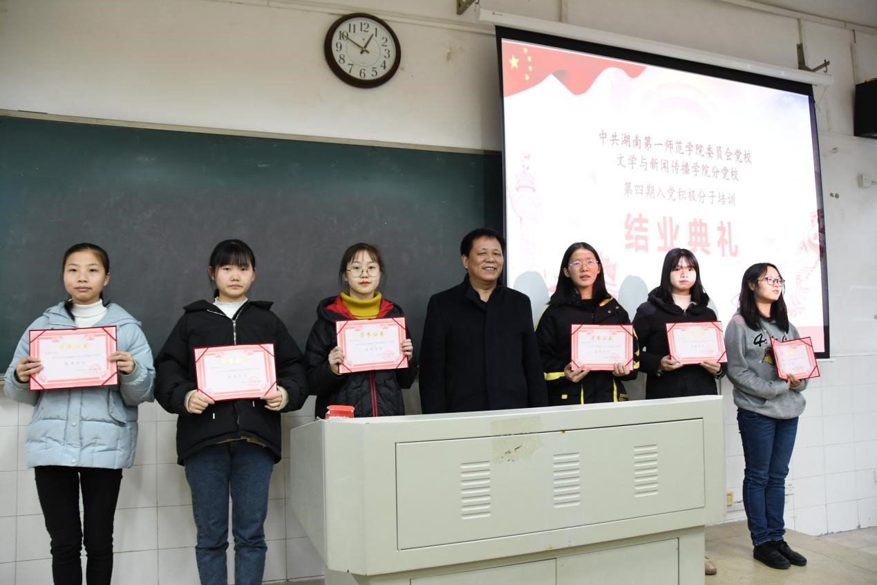 随后,优秀学员代表2018级767中文班罗草同学上台发言,表达了对分党校诚挚的感谢,并表示不仅会在组织上积极入党,更会在思想上、行动上积极入党。最后,欧阳范剑副书记给优秀学员颁发证书并合影留念。