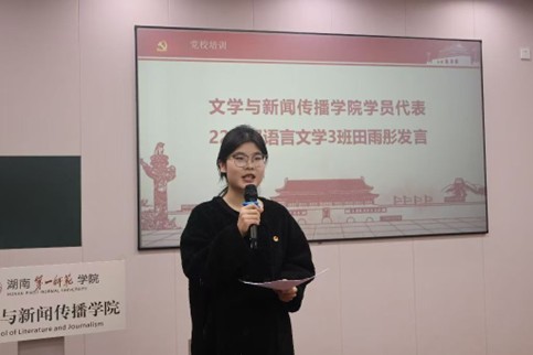 来自22级中文3班的田雨彤代表全体学员发言,她表达了自己坚定的入党之心,呼吁在座学员敢担当、善作为,在实践中锤炼党性,充分发挥先锋模范作用,携手共进,用心用情用力书写青春华章。