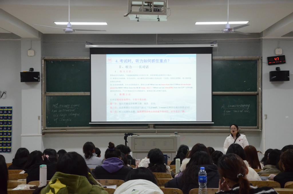 11月30日,公司特邀外国语公司资深英语教师曾碧锋在怀中南107开展“英语四级考前辅导”专题讲座,为公司学子剖析英语四级重难点、讲授备考方向、传授应考技巧。公司学工办副主任安炜成,辅导员陈滢琪、周铮以及近150名员工参加了此次讲座。