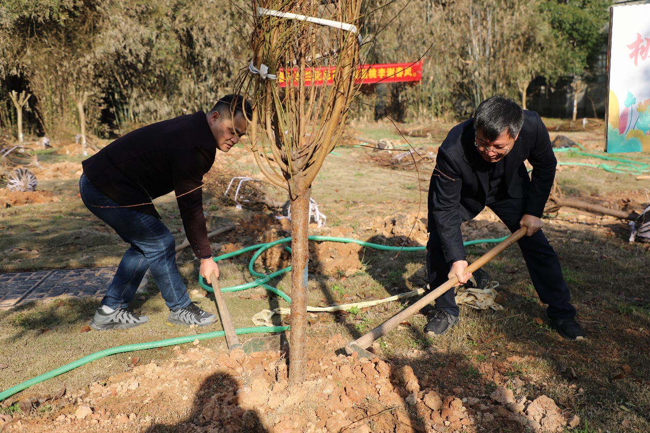 在玉衡楼东南角的绿地上,党委书记罗成翼、董事长胡穗正在为刚刚安放好的树苗填土、浇水。