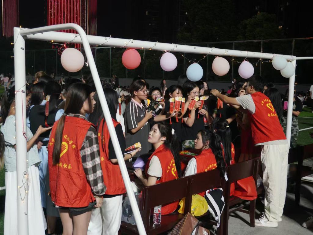 趣味灯谜,竞相抢答。传统文字与充满创意的 emoji 灯谜纸条在空中摇曳,极大地激发了同学们的好奇心和挑战欲。同学们围聚在灯谜下,或独自思索,或与伙伴们一同讨论着谜底,每当有同学猜出新的谜底,现场都会响起一片赞扬声。