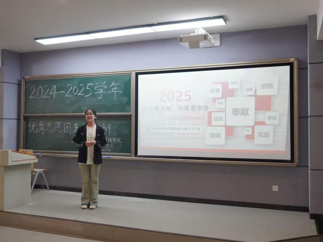 答辩现场,参评团支部通过一份份可视化数据展示集体服务成效,各支部的志愿者注册人数均达到100%,年均志愿服务总时长逾数百小时,展现了出色的志愿服务成果。如,22级汉教1班相继开展“化‘凌’为整”图书馆志愿活动、“红心永不褪色,传承永不息”退伍老兵口述史整理等多项班级志愿活动;23级中文5班持续开展“予她同行”卫生巾互助盒公益活动,通过常态化关怀行动传递温暖与关怀,助力“幸福一师”建设。