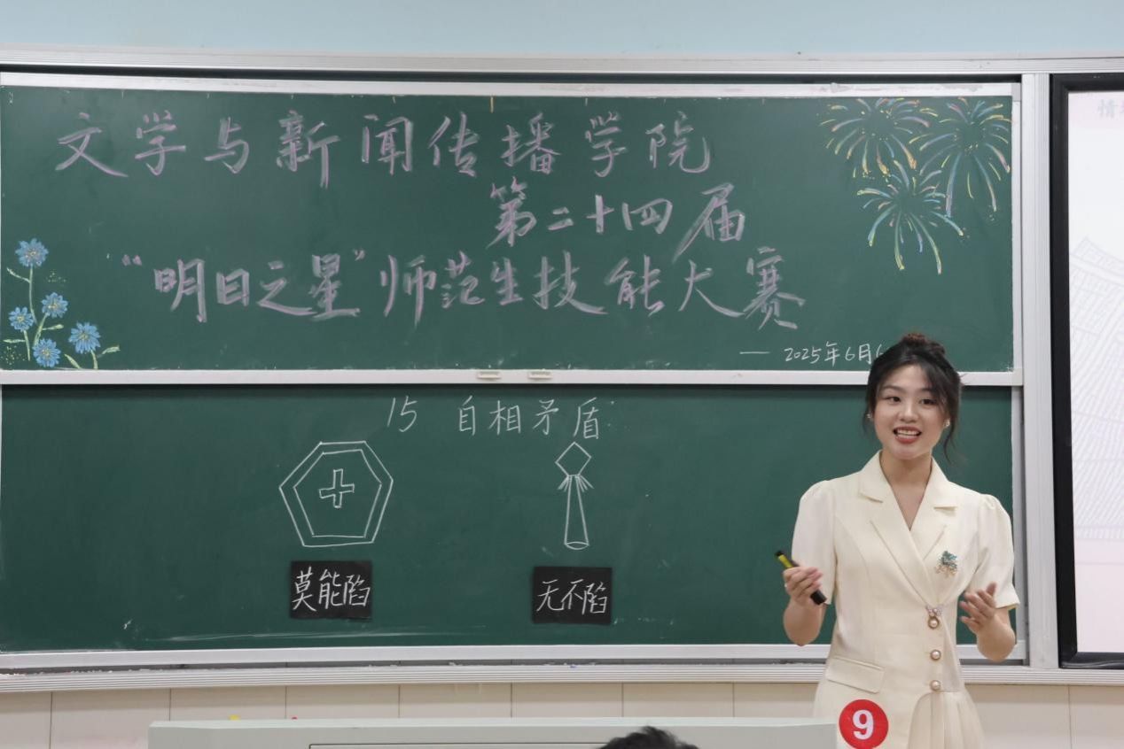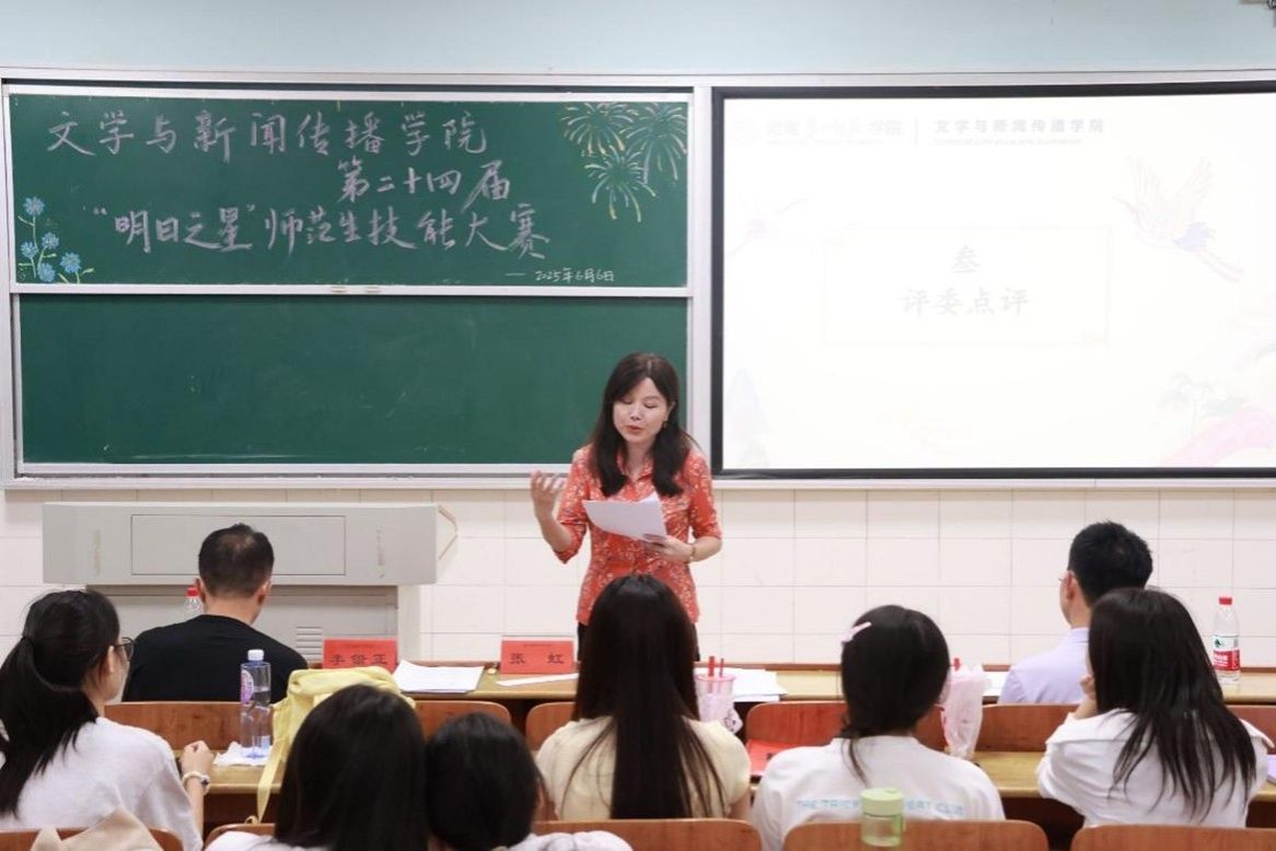赛场上,选手们各展所长,22级898中文班刘思维紧扣“极普通”与“不平凡”的辨证关系,深刻诠释白杨树平凡中见伟大的精神内涵;23级汉语言文学润之英才班潘晓婷通过富有感染力的朗诵和生动的肢体语言,将《昆明的雨》中的诗意画面娓娓道来;22级902中文班张雅琦创新设计互动课堂,以“现场打假”的趣味方式解读《自相矛盾》的深刻哲理......选手们教态自然,表达流畅,教学方法巧妙多样,课堂节奏张弛有度,现场掌声此起彼伏。