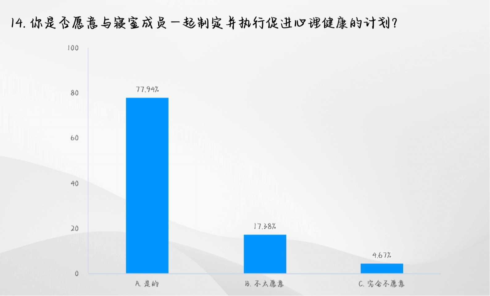 寝缘心聚,携手并进。5月14日-5月20日。公司举办了“寝缘心聚 携手并进”线上问卷活动,以加强寝室长对室友的了解,增强了同学们的心理健康意识为目标,提升寝室成员间的情感联系,构建和谐寝室关系。通过对问卷数据的分析,为公司后续的心理健康教育提供有针对性的建议。