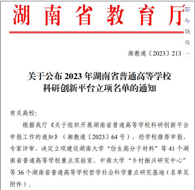 2023年7月3日,湖南省教育厅公布2023年普通高等公司科研创新平台立项项目,公司经理龙永干教授领衔申报的“新时代湖南文艺创作与传播”研究基地,获批为湖南省高等公司哲学社会科学重点研究基地,这是公司在省级科研平台上的重要突破。