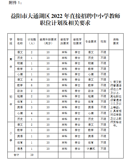 附件:1.益阳市大通湖区2022年直接招聘中小学教师职位计划及相关要求