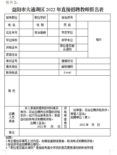 2.益阳市大通湖区2022年直接招聘教师报名表