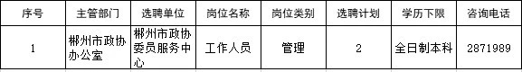 郴州市政协委员服务中心是郴州市政协办公室管理的财政全额拔款正科级公益一类事业单位。2019年计划选聘事业单位工作人员2名。2019年郴州市政协委员服务中心公开选聘计划岗位信息表.doc
