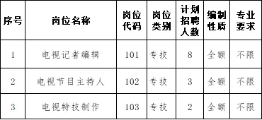 计划招聘工作人员13名,具体招聘岗位、计划数及资格条件等详见《2019年郴州市广播电视台公开招聘工作人员计划岗位信息表》(附件1)。