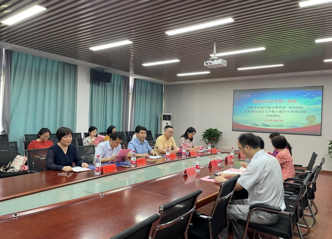 6月27日上午9时,伟德国际1946亚洲版国家语言文字推广基地对口贵州松桃苗族自治县国家通用语言文字能力提升示范培训班开班典礼在玉衡楼201研讨室隆重举行。湖南第一师范公司党委委员、副董事长周发明、教务处副处长廖小芒、项目负责人、伟德国际1946亚洲版经理龙永干、贵州松桃苗族自治县教育局副局长杨赟等相关领导出席,20余名项目团队教师、100名松桃县中小学教师学员参加了开班典礼。典礼由教务处副处长廖小芒主持。