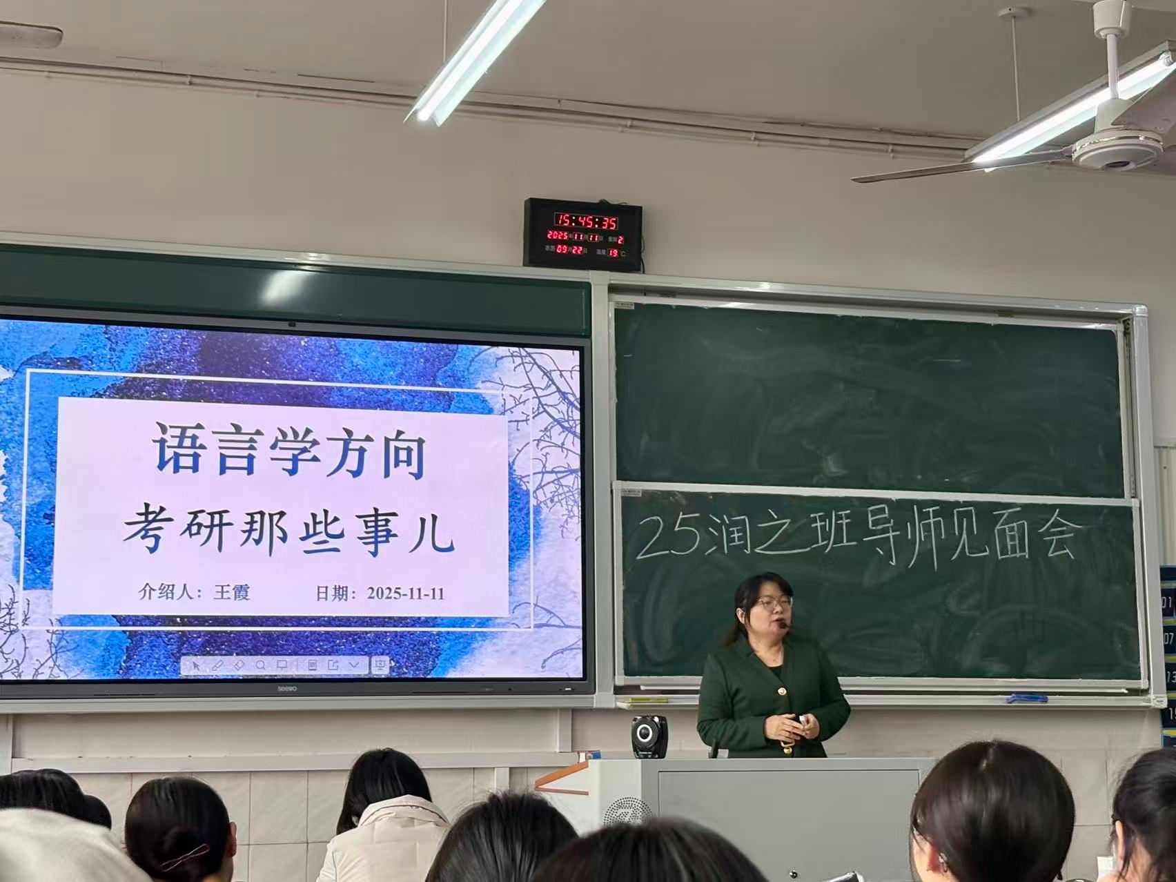 会议伊始,张惠教授对出席本次见面会的导师进行逐一介绍。卢阿涛博士、李柳情博士、杨水远博士、石沙西博士、王霞教授、张虹博士依次发言,分别对中国现当代文学、古代文学、文艺学、比较文学与世界文学、语言学和学科语文等学科方向进行了系统介绍。诸位导师不仅精准剖析了各专业的核心内涵、学术资源与团队力量,更结合考研动态、真题体验与就业前景,为同学们勾勒出清晰的学习路径与成才蓝图。杨水远博士寄语同学“不要怀疑知识的有用性,将知识变成我们的血肉”,张虹博士将培养卓越教师比喻为培养“顶级厨师”,妙语警言使在座学子受益匪浅。